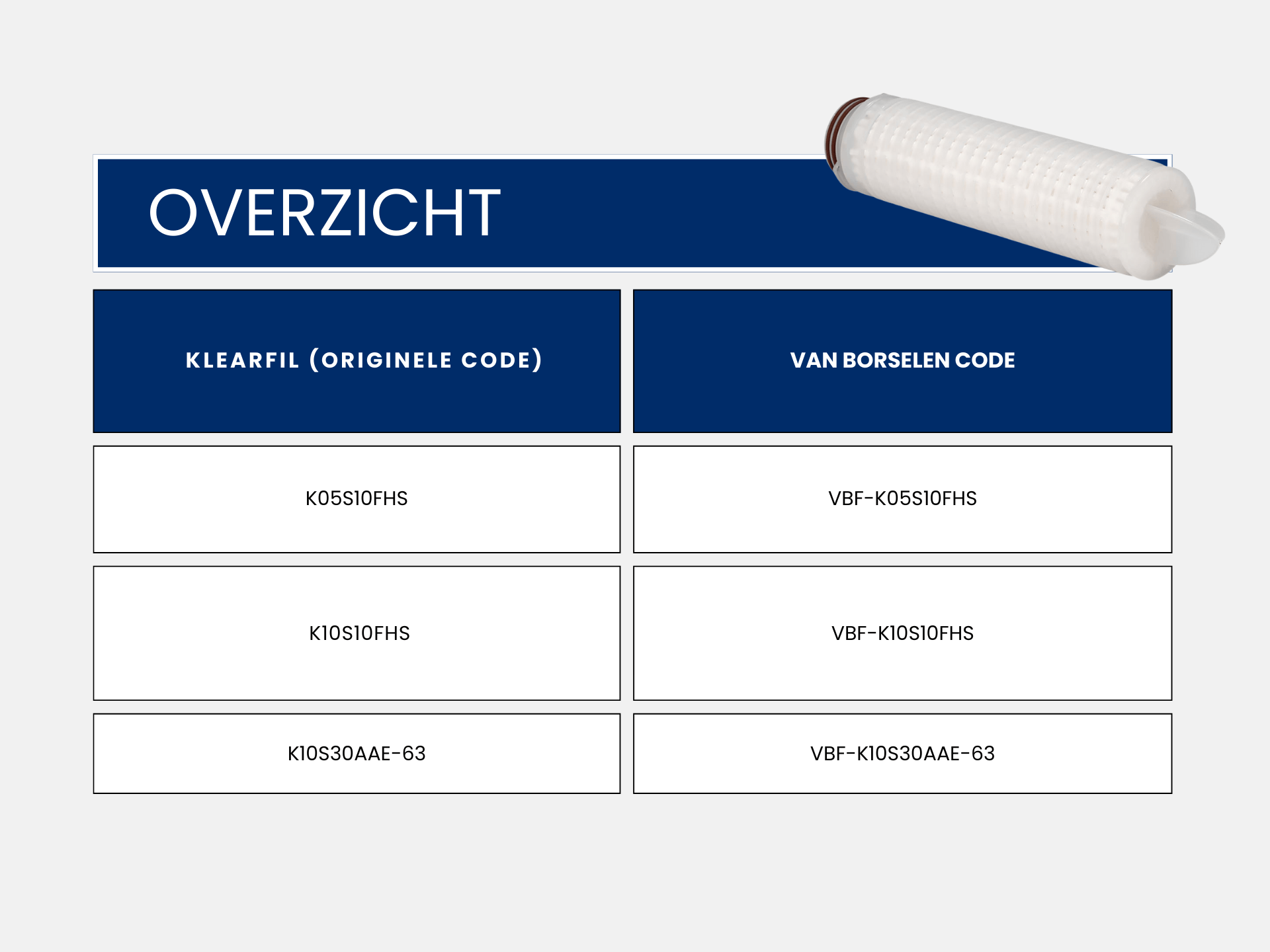 Bent u op zoek naar originele Klearfil polypropyleen filterkaarsen? Van Borselen levert de equivalente producten van hoogwaardige kwaliteit en helpt u direct bij het vinden van de juiste vervangcode.