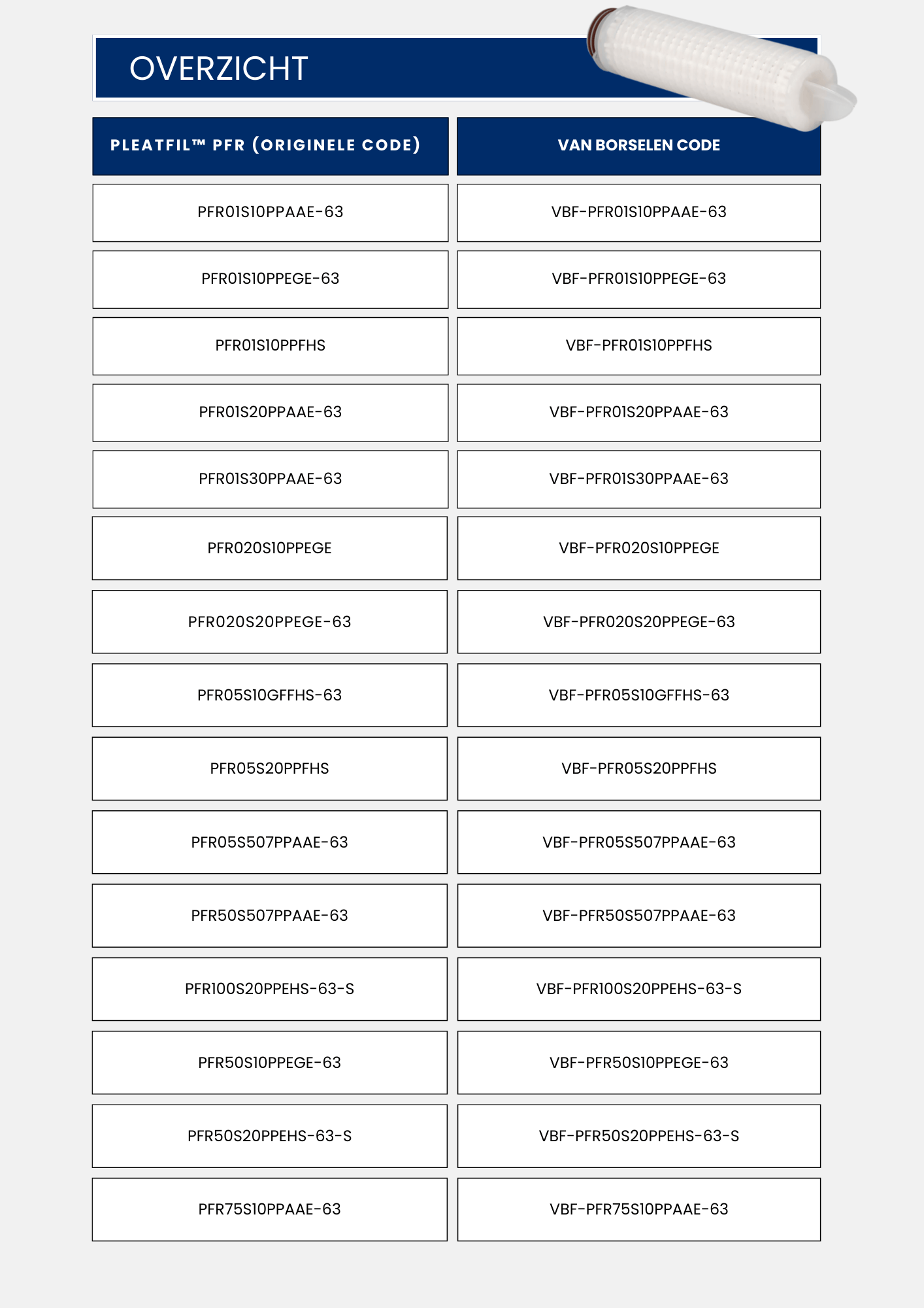 Hieronder vindt u een overzicht van de originele Pleatfil™ PFR-artikelnummers en de nieuwe Van Borselen equivalenten.