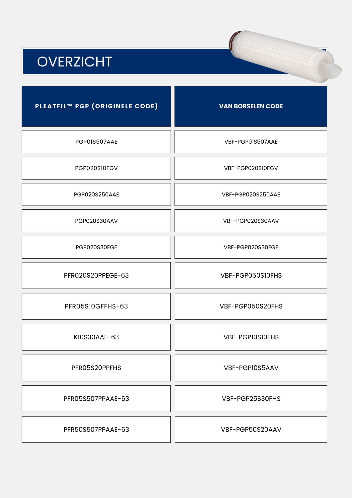 Hieronder vindt u een overzicht van de originele Pleatfil PGP-artikelnummers en de nieuwe Van Borselen equivalenten.